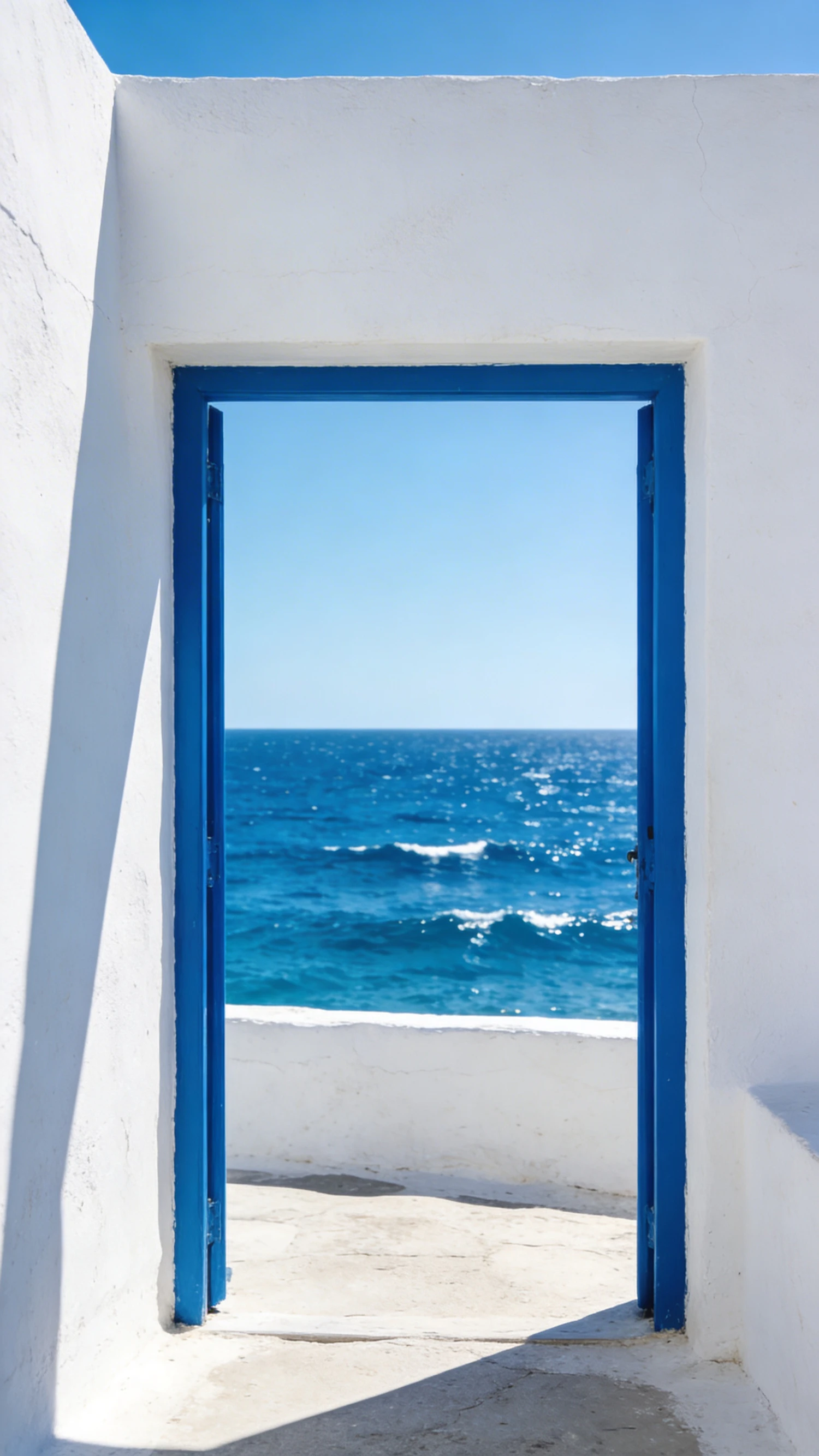 A vibrant blue door frame in a white wall opens to a stunning view of the sparkling sea under a clear blue sky.