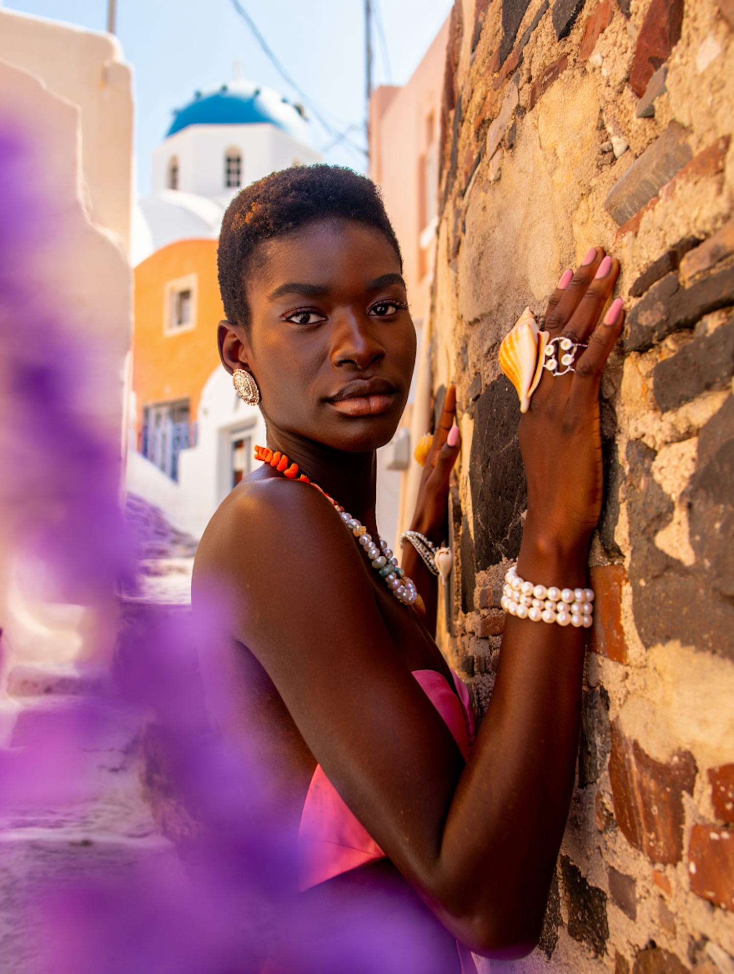 Woman wearing bold jewelry against a stone wall with a stunning Mediterranean backdrop and blurred purple accents.