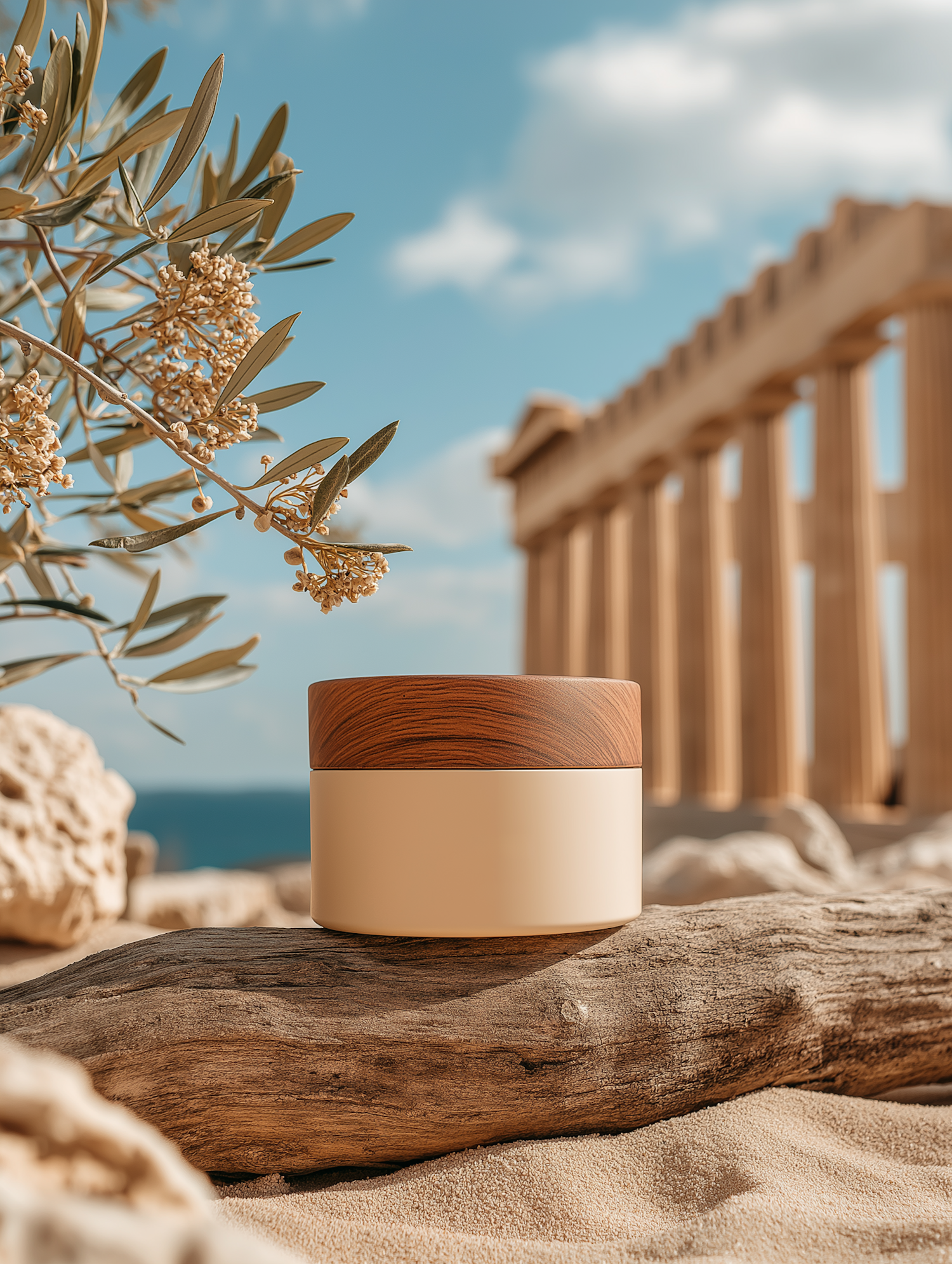 A beige container with a wooden lid sits on driftwood, framed by olive branches and ancient Greek columns under a blue sky.