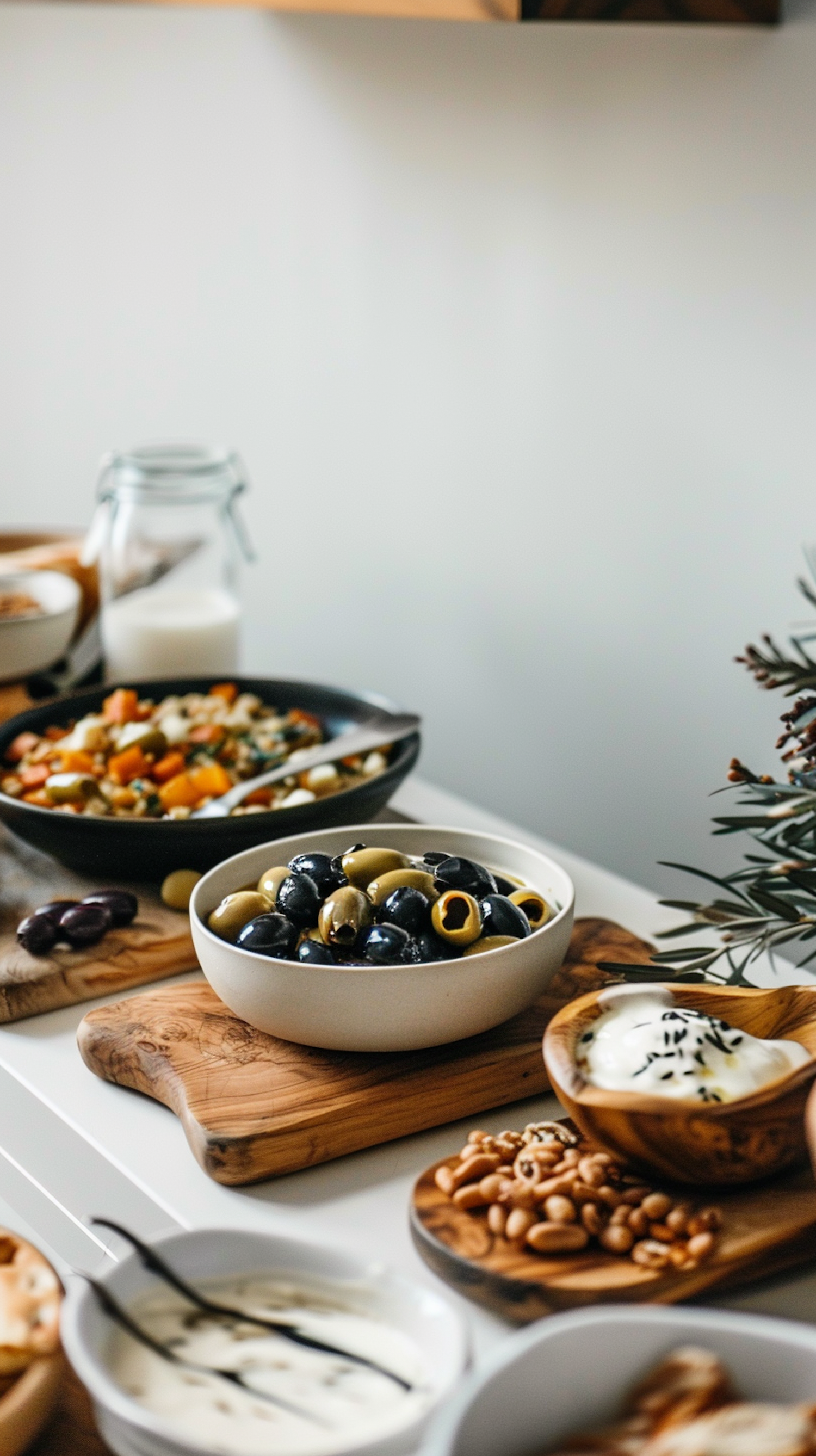 Mediterranean spread with olives, yogurt dip, and colorful veggies on a rustic table setting.