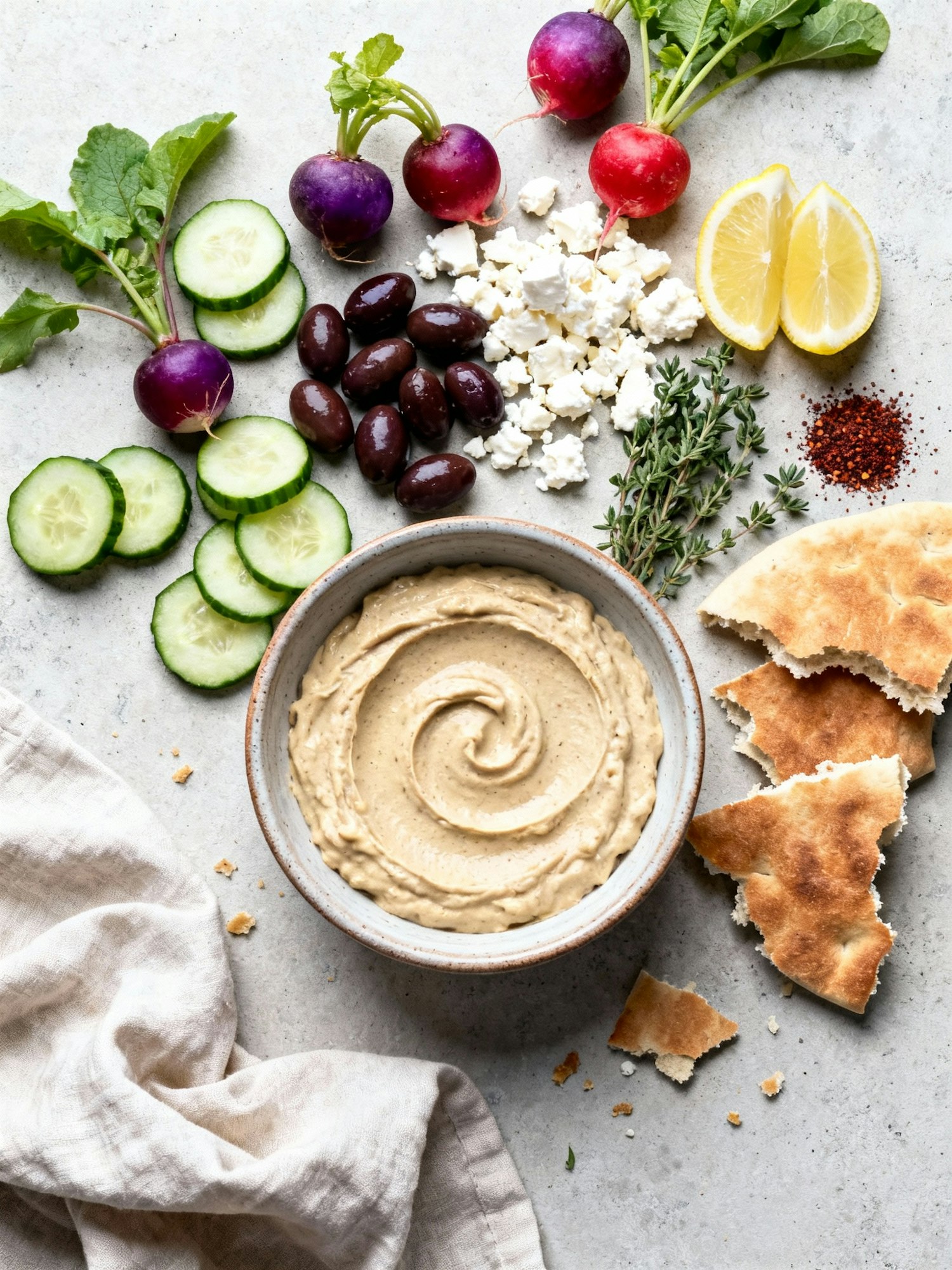 Ultra-real overhead flat lay of raw ingredients: tahini swirl in a ceramic bowl, cucumber rounds, radishes with tops, Kalamata olives, crumbled feta, lemon wedges, oregano sprigs, a pinch of sumac, and warm pita torn; linen napkin softly wrinkled; subtle crumbs. Medium-format (150MP); 55–65 mm at f/8; big soft overhead 5600 K source through 6×6' diffusion, perimeter flags for gentle falloff; ISO 100. Angle: true 90° top-down. Surface: pale concrete. Color: clean neutrals with muted greens/purples. Negative: perfect grid symmetry, fake garnish, excessive contrast, color cast, logos, watermarks.