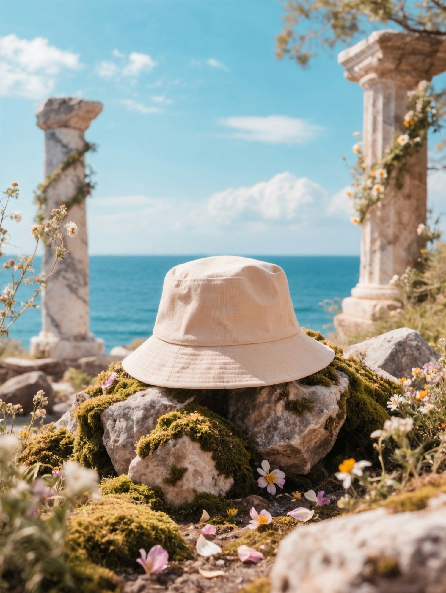 A beige bucket hat on mossy rocks with wildflowers, framed by ancient columns and a stunning ocean backdrop under a clear blue sky.