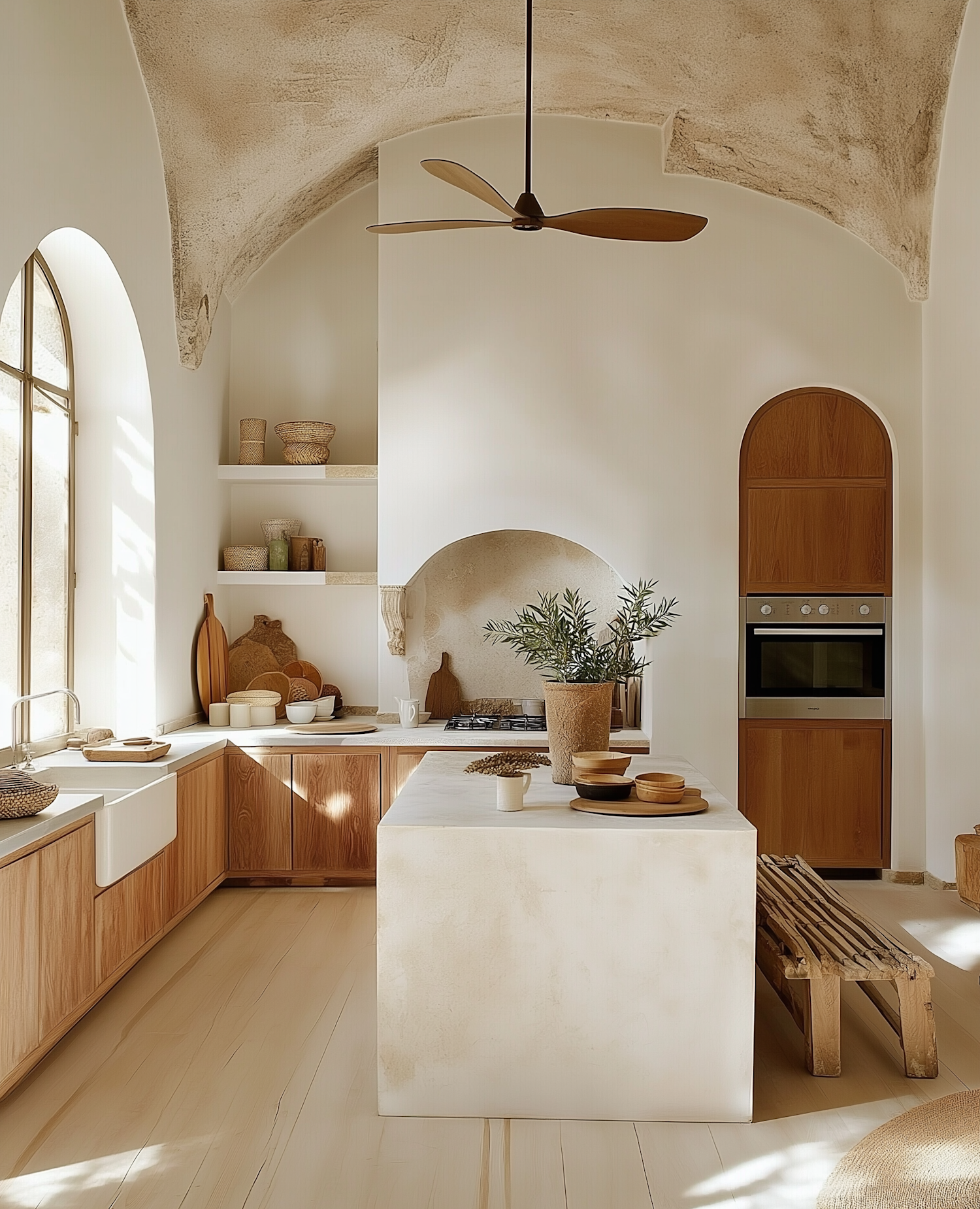 A Mediterranean-inspired kitchen with arched ceilings, natural wood cabinets, and a central island, bathed in warm natural light.