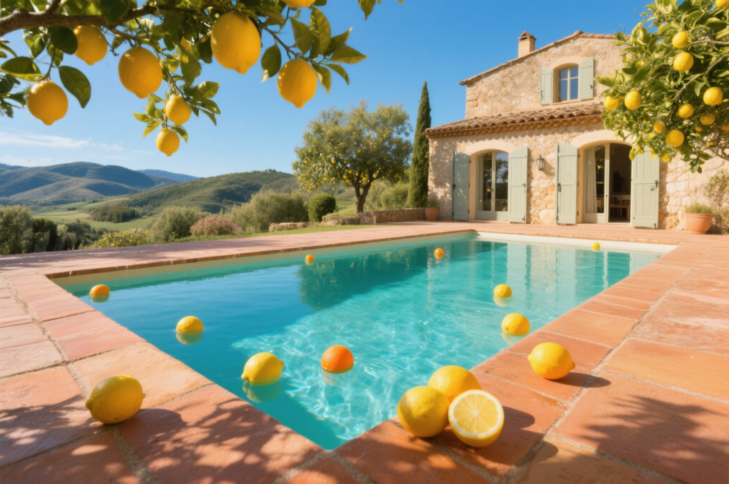 Rustic stone house with a pool surrounded by lemons and lush greenery, set against a backdrop of rolling hills and a clear blue sky.