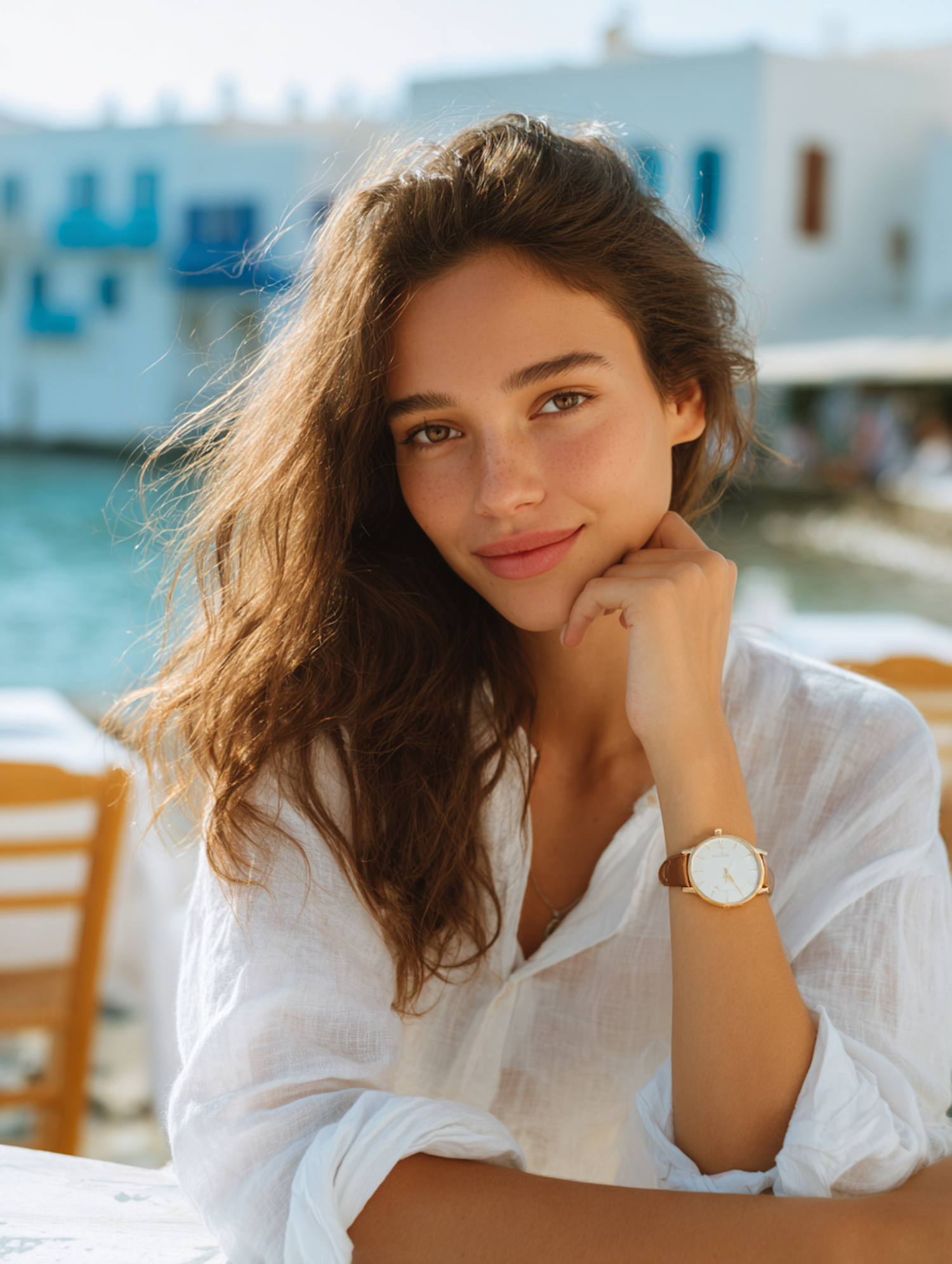 A woman with wavy brown hair and a white blouse sits near a waterfront, with Mediterranean-style buildings in the background.