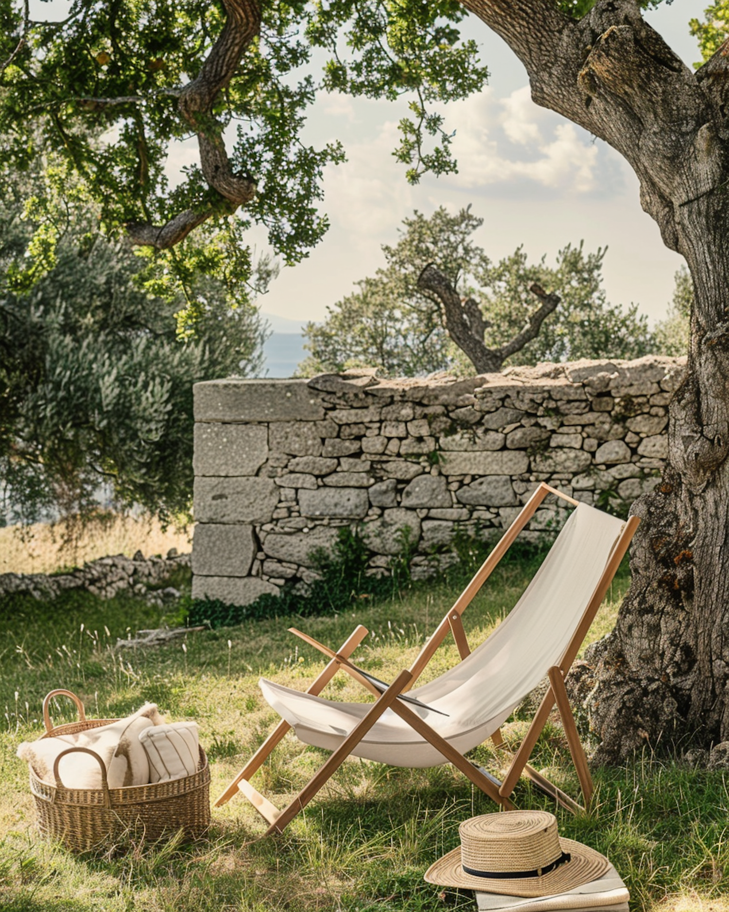 Relaxing outdoor setup with a deck chair, basket, and straw hat under a tree near a rustic stone wall in a sunny countryside.