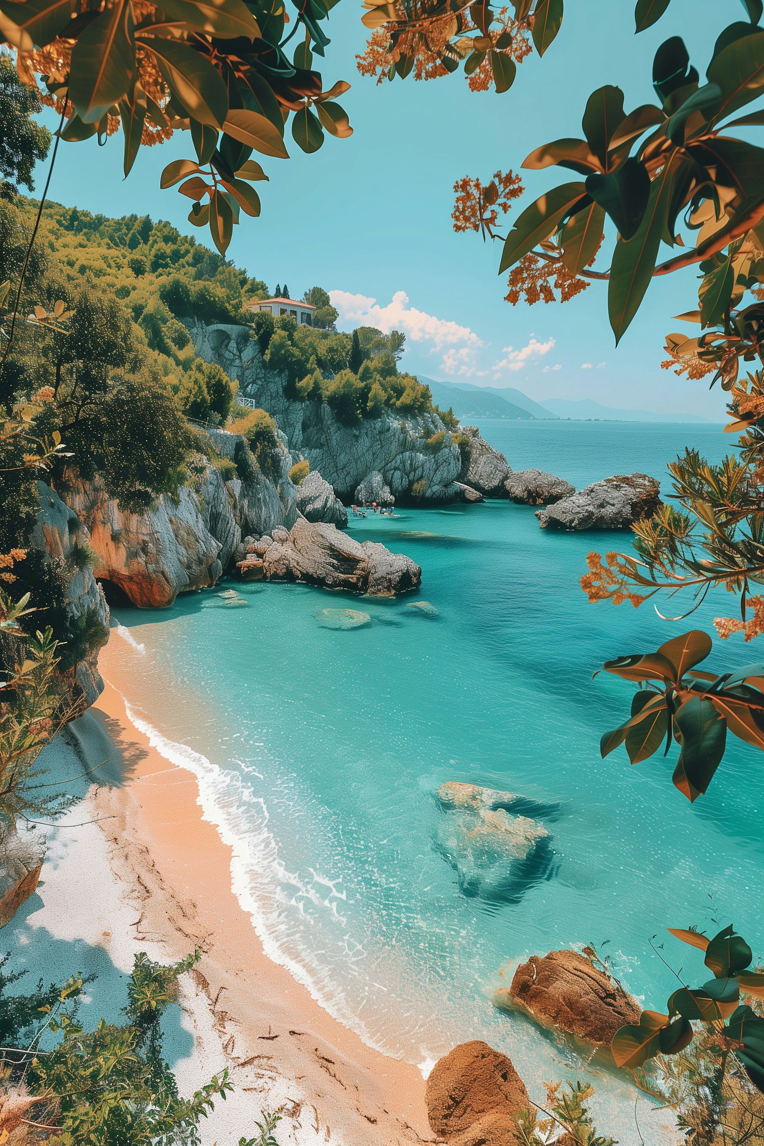 Stunning coastal view with turquoise waters, sandy beach, and lush cliffs. Framed by leaves, a white building sits atop the cliffs.