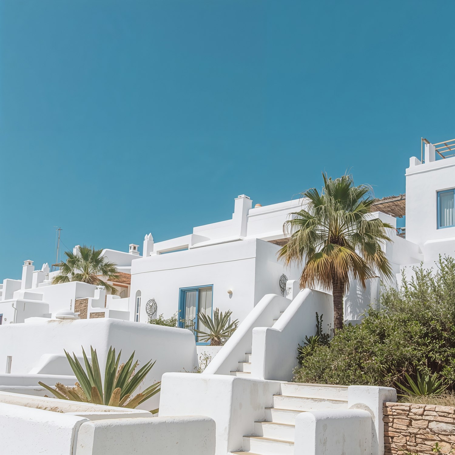 Mediterranean-style whitewashed buildings with blue accents, surrounded by lush greenery and a clear blue sky, exuding coastal charm.