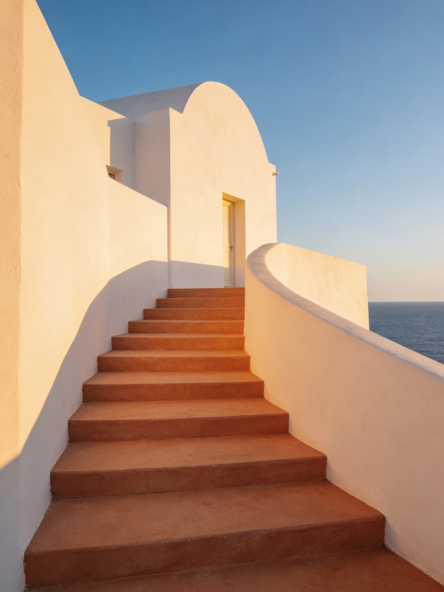 A white building with terracotta steps leading upward, placed against a clear blue horizon, soft golden-hour lighting, minimal composition, no text.