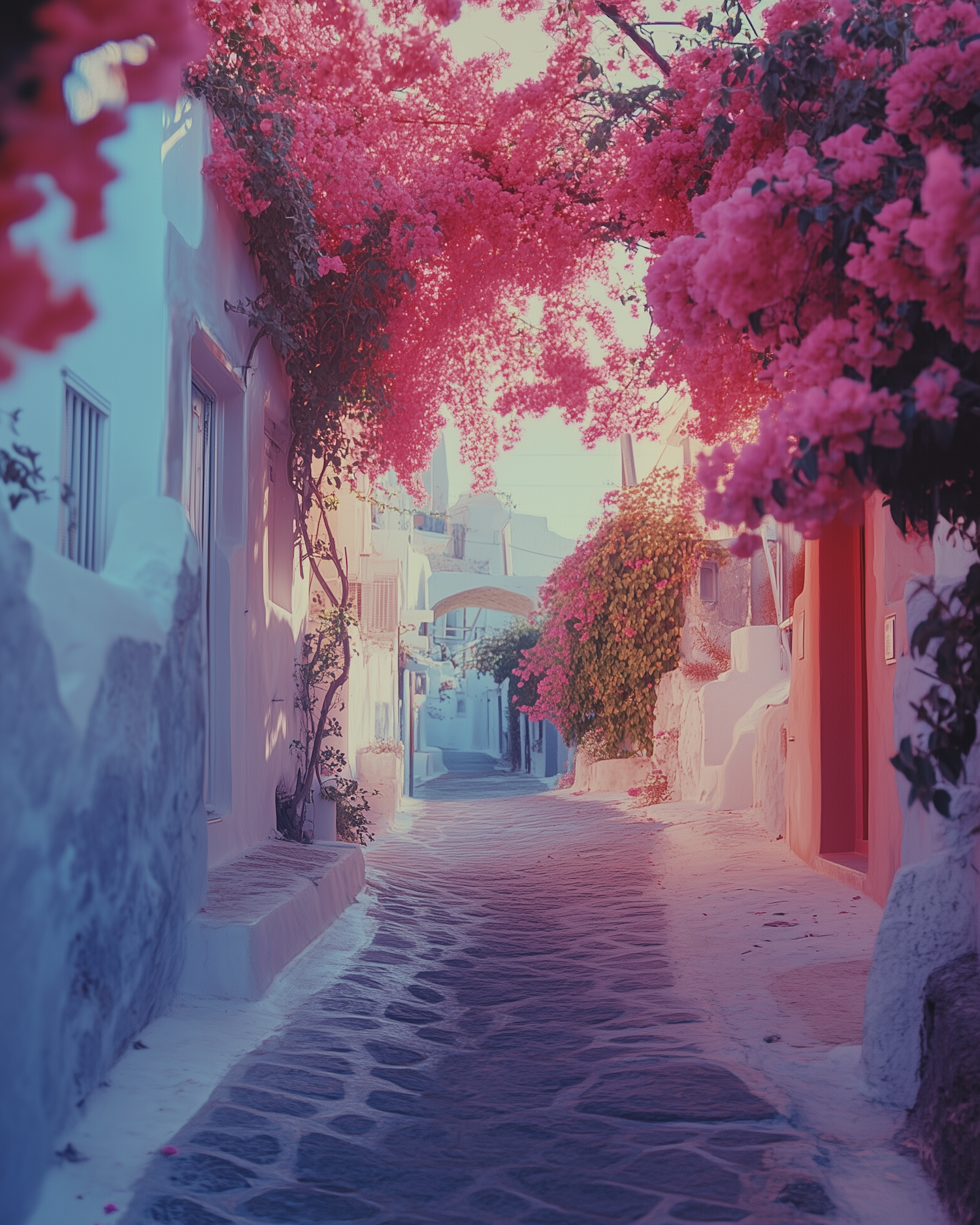 Charming Mediterranean street with whitewashed buildings and vibrant pink bougainvillea flowers cascading overhead.