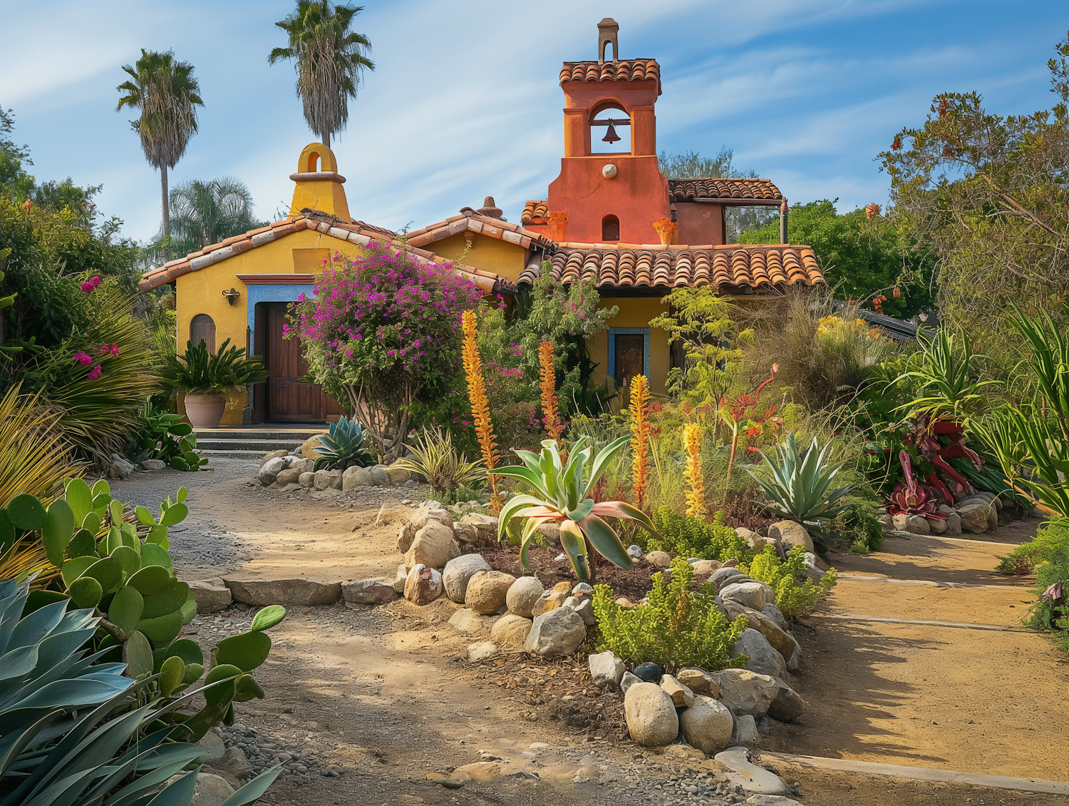Charming Spanish-style house with vibrant garden, terracotta roof, and bell tower, surrounded by lush succulents and palm trees.