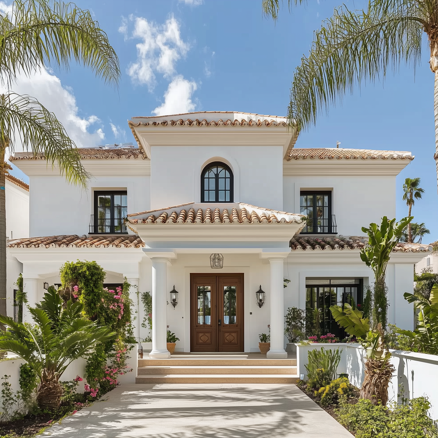 Luxurious Mediterranean villa with white stucco, terracotta roof, and lush greenery under a clear blue sky.