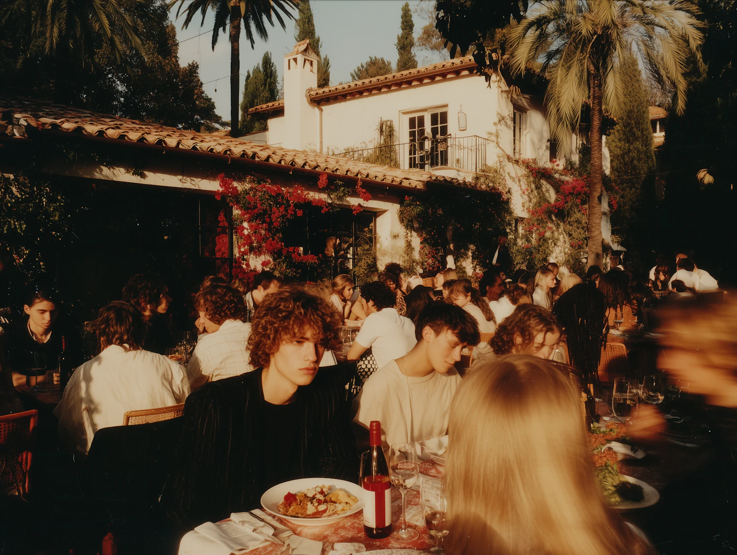 A warm outdoor gathering at a Mediterranean-style villa, with people enjoying food and drinks amidst vibrant bougainvillea and golden sunlight.