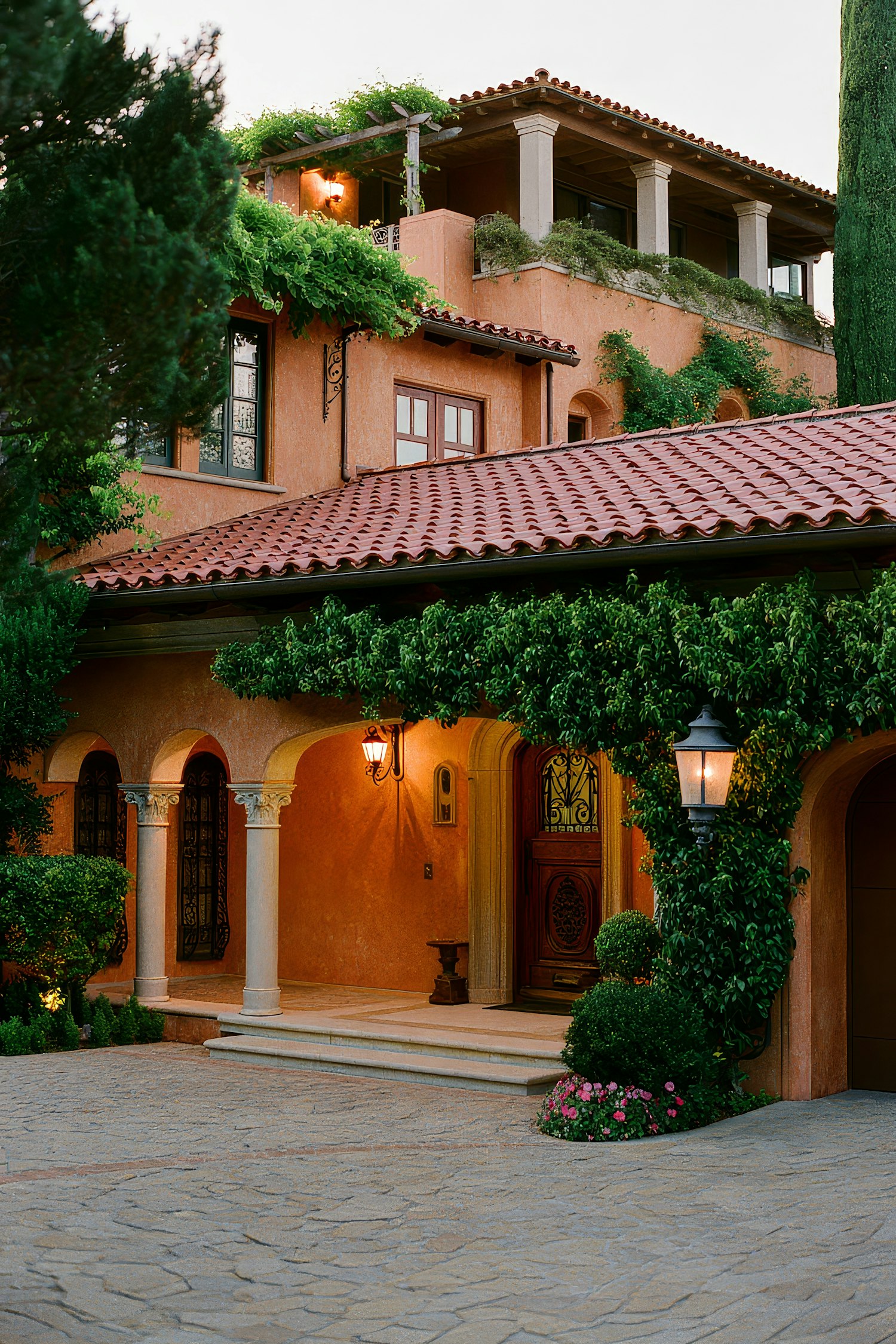 Mediterranean-style villa with terracotta walls, red-tiled roof, lush greenery, and elegant arched doorways. Warm and inviting ambiance.