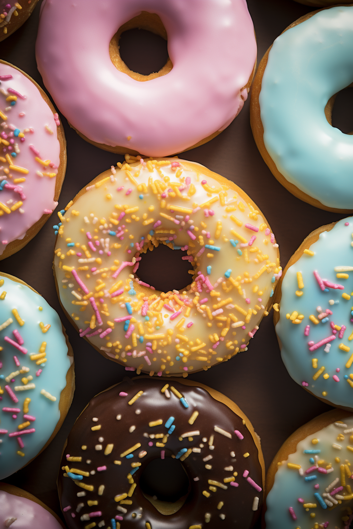 Colorful donuts with pastel icing and sprinkles create a vibrant, tempting display. Perfect for sweet tooth cravings and dessert inspiration.