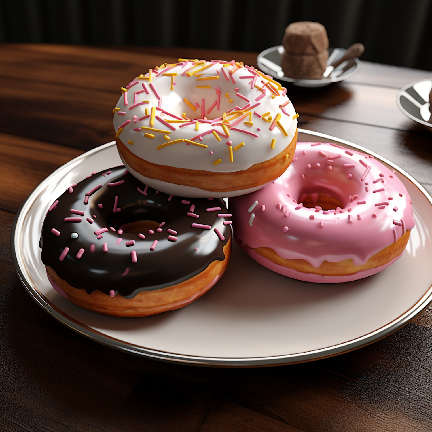 A plate of three colorful donuts with white, chocolate, and pink icing, topped with sprinkles, on a wooden table.