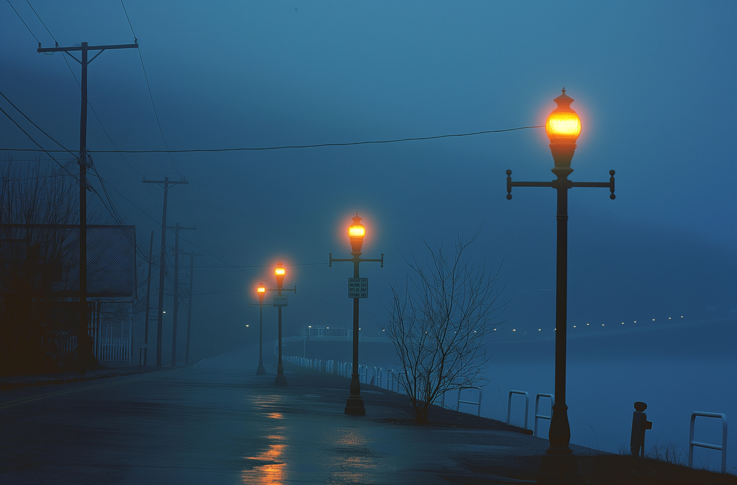Misty street with vintage lamps casting warm glow on wet pavement, creating a tranquil, mysterious twilight scene.
