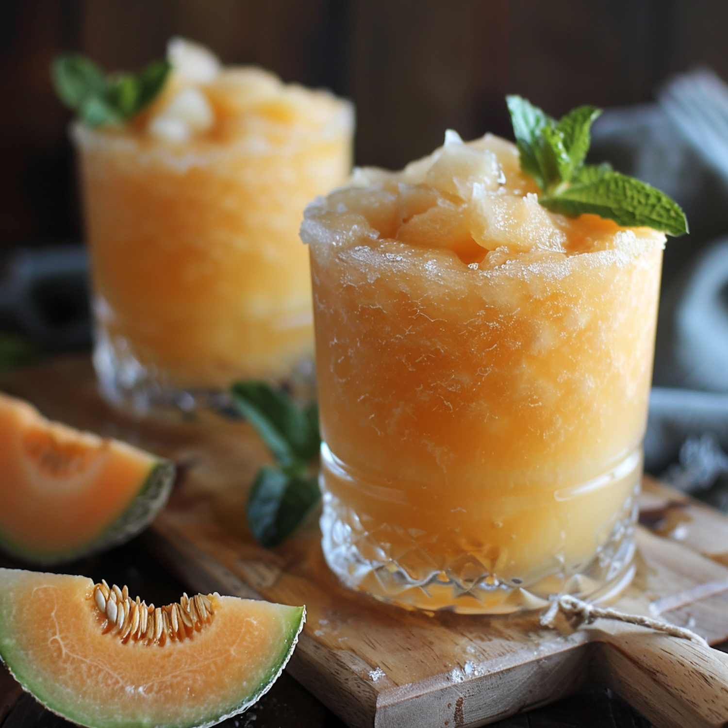Refreshing orange slushy drinks with mint garnish and cantaloupe slices on a wooden board, perfect for a summer treat.