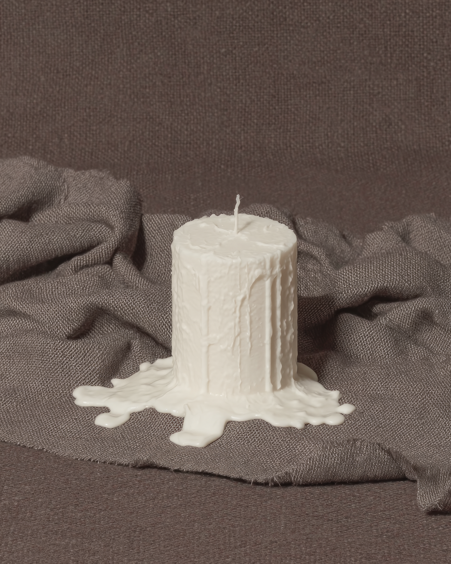 A white candle melting on a gray fabric background, with wax pooling around its base, creating a textured and artistic scene.