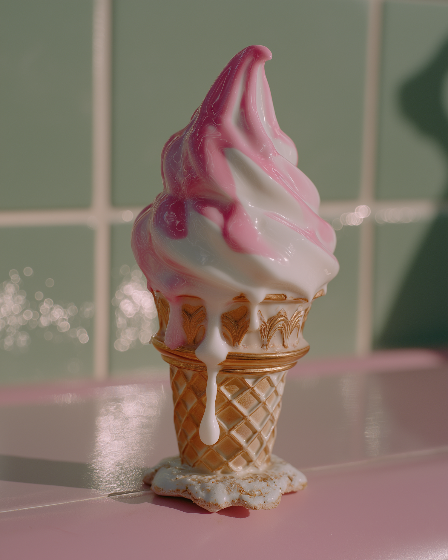 Melting pink and white soft-serve ice cream in a golden cone, set against a retro green tile and pink surface background.