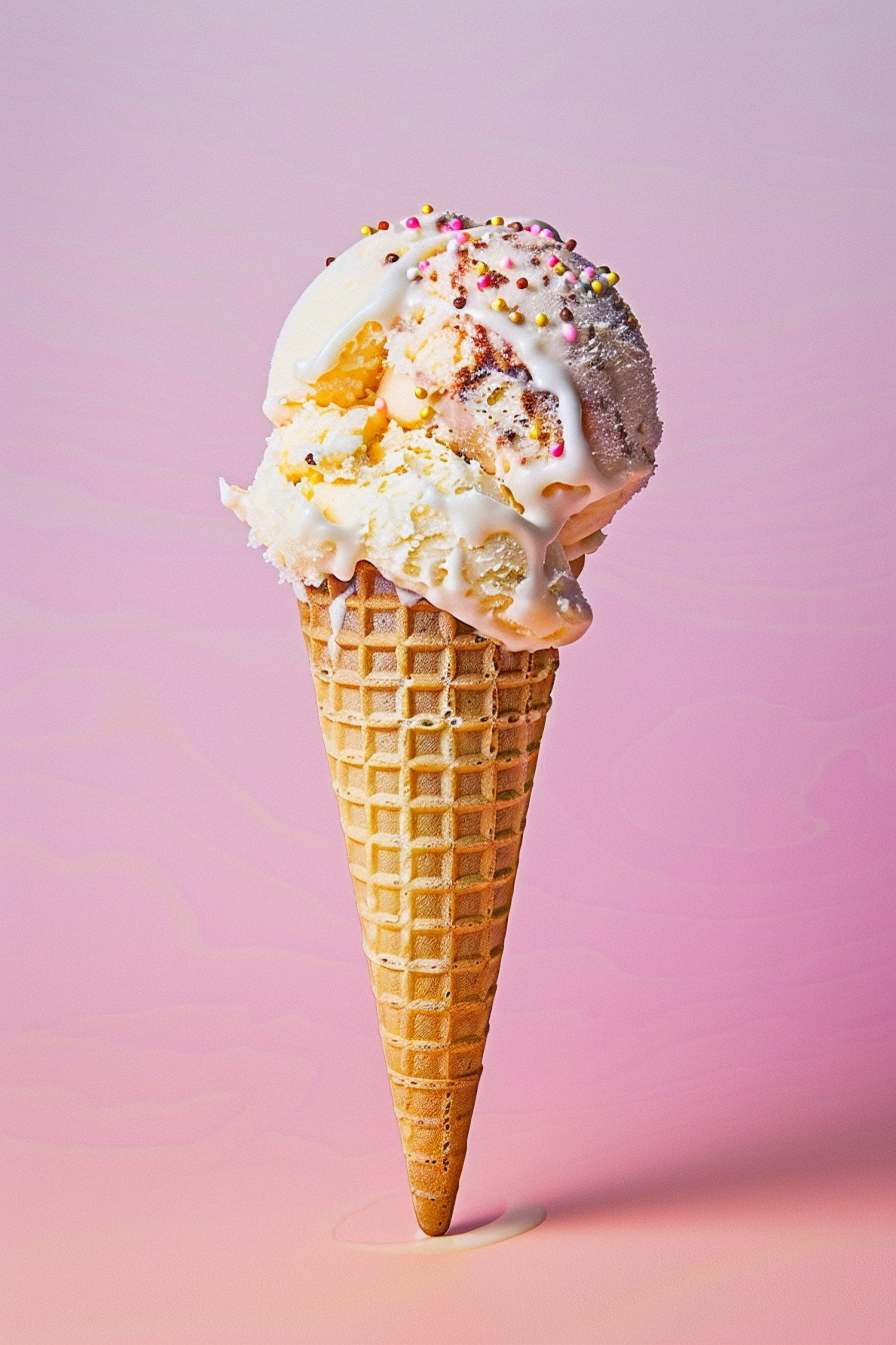 Vanilla ice cream cone with colorful sprinkles against a pink background, showcasing a delightful summer treat.