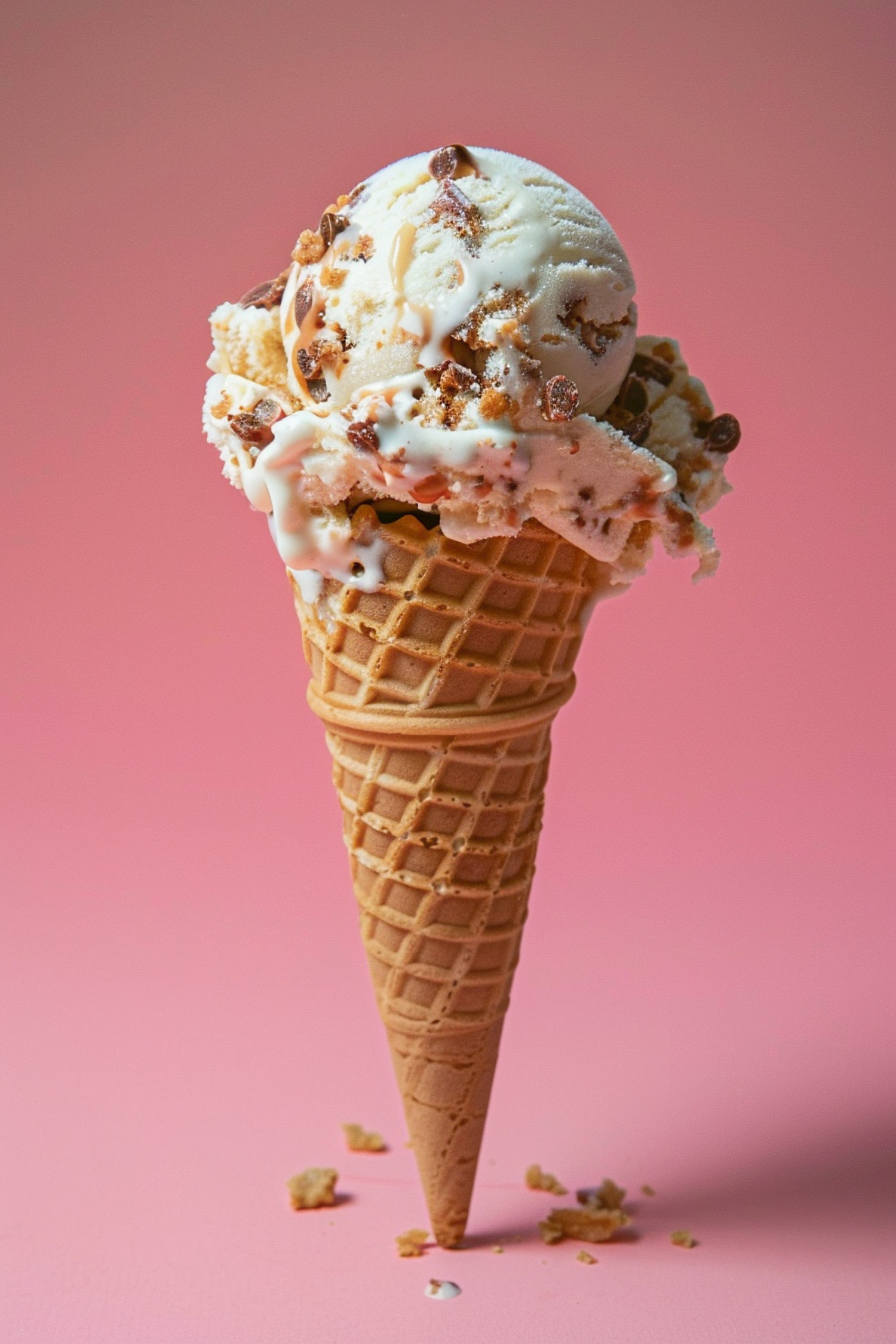 Melting Vanilla Ice Cream Cone with Caramel and Cookie Dough