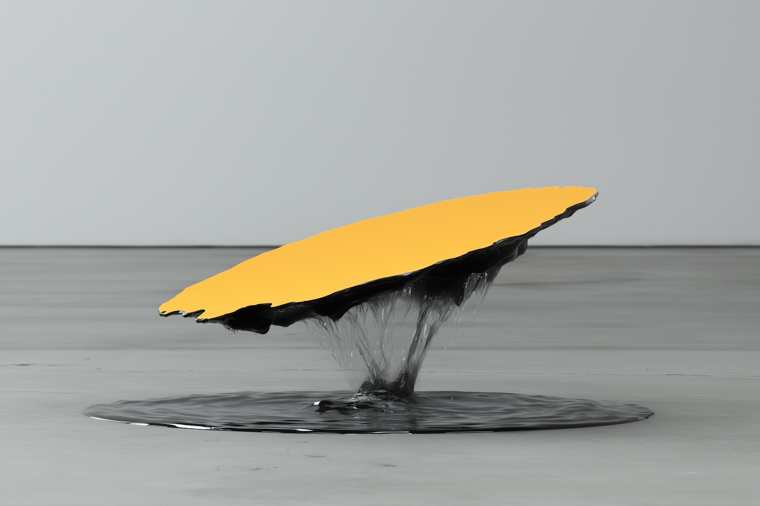 A bold yellow disc seemingly melting into a pool of glossy black liquid, set against a minimalist gray background. Modern art at its finest.