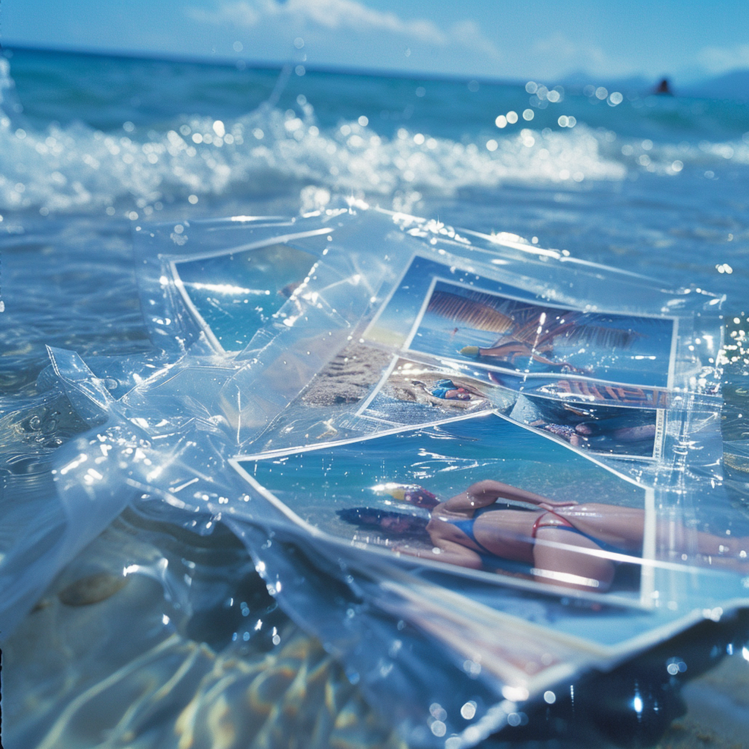 Photos in a plastic bag float on clear ocean water, capturing beach scenes under a sunny sky.