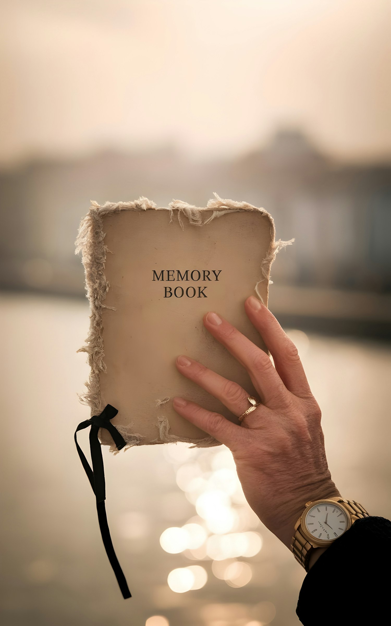 A hand holding a tattered 'Memory Book' with a gold watch and ring, set against a warm, reflective water background.