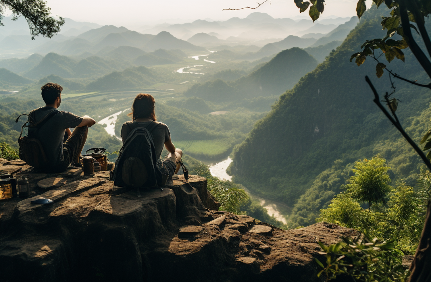 Two hikers rest on a rocky ledge, overlooking a lush valley with rolling hills and a winding river under soft natural light.