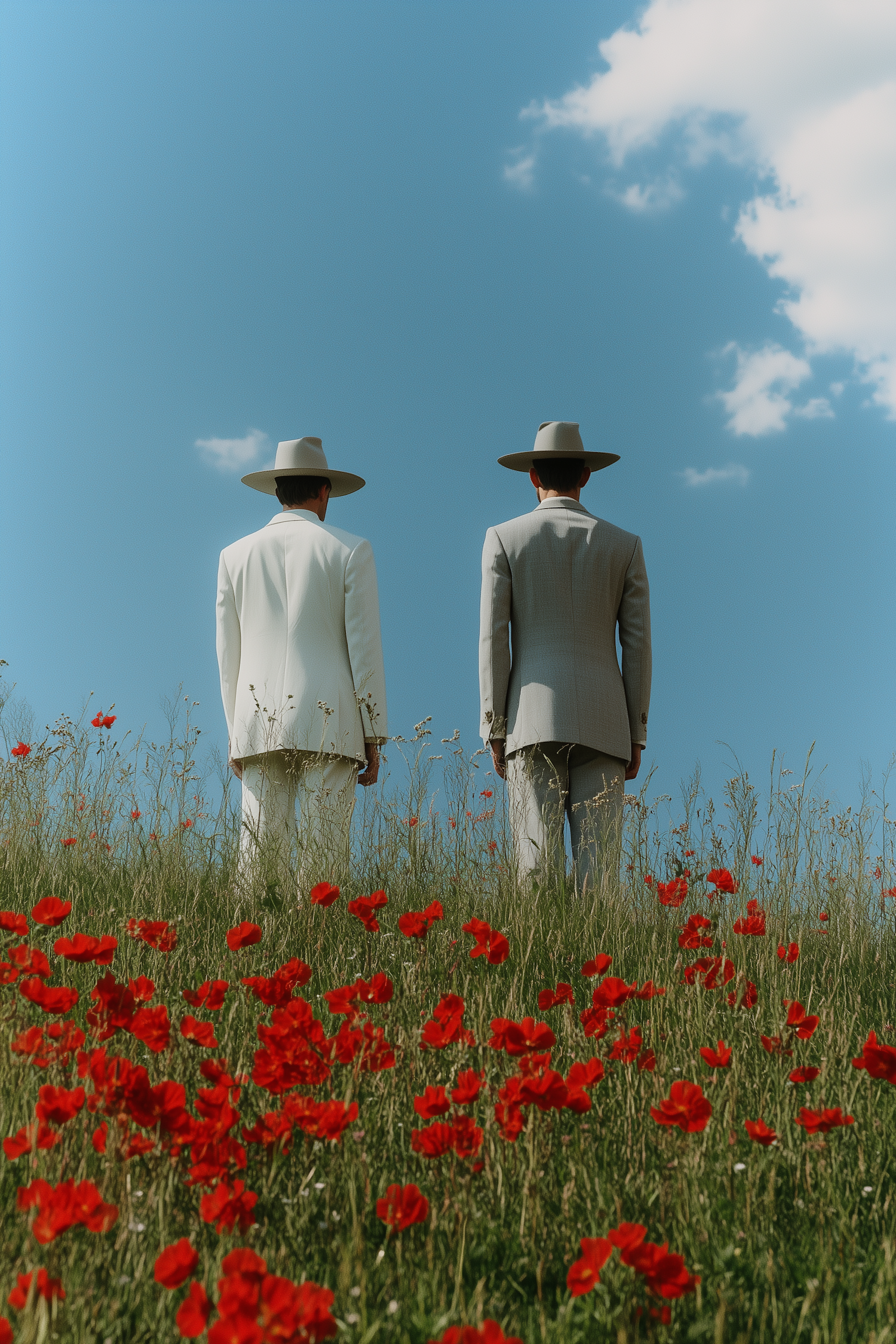 Two men in suits and hats stand in a poppy field under a clear blue sky, creating a striking contrast with the vibrant red flowers.