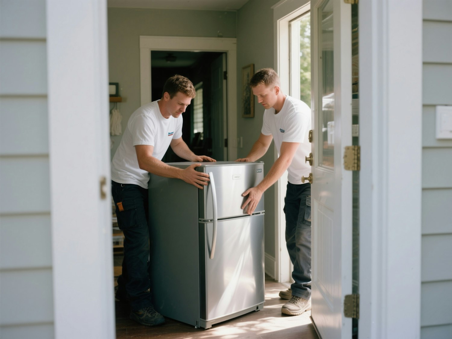 Two movers carefully bring a compact silver refrigerator into a house, working together in a bright, welcoming space.