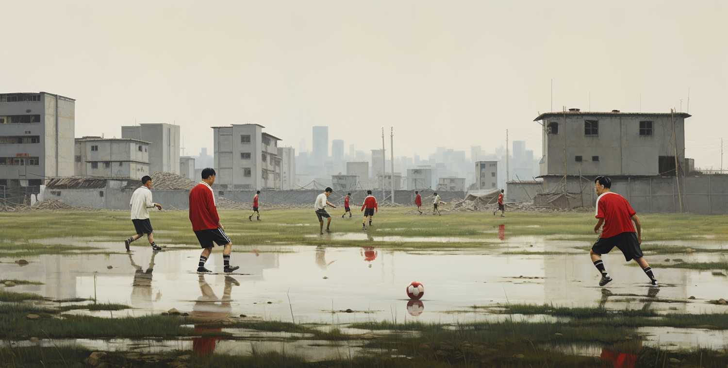 Young men play soccer on a muddy field in an urban setting, surrounded by old buildings and a misty city skyline.