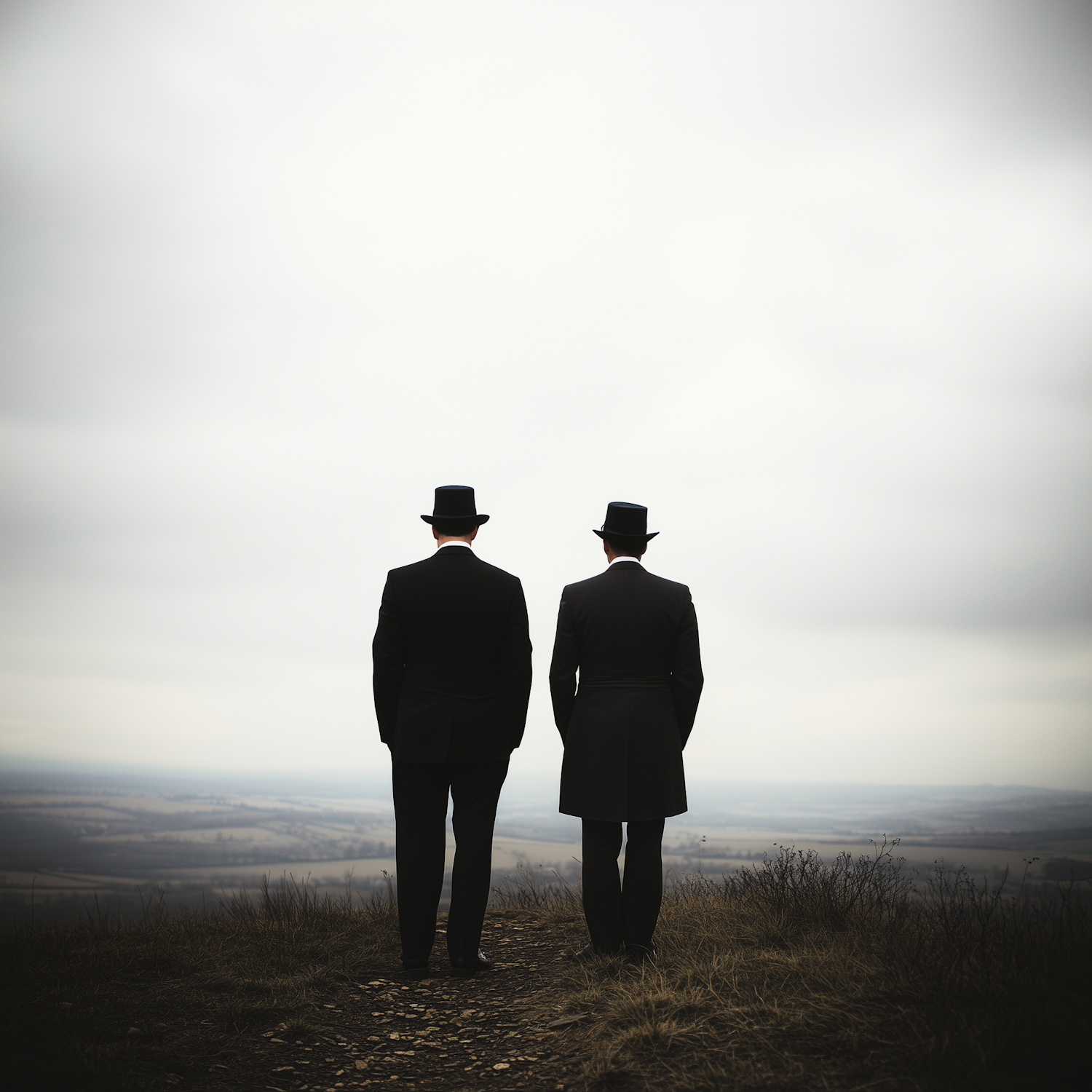 Two men in black suits and top hats stand on a hilltop, overlooking a misty landscape under an overcast sky.