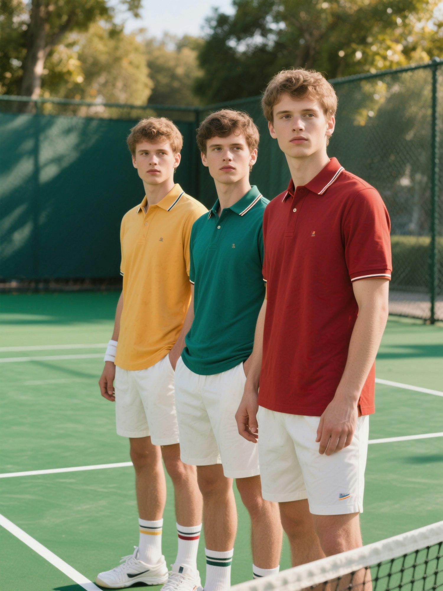 Three young men in colorful polo shirts stand on a tennis court, showcasing casual sportswear in a sunny outdoor setting.