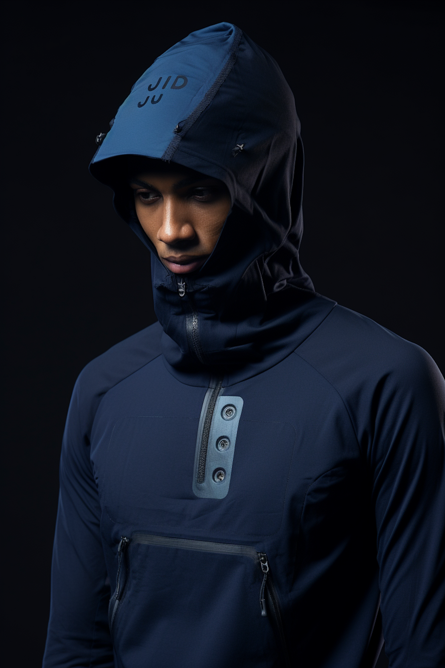 Stylish man in a navy-blue hooded jacket with modern details, dramatic lighting, and a sleek black background.