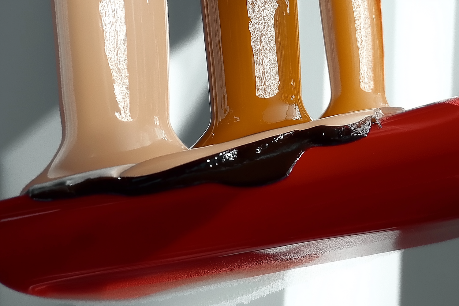 Glossy streams of beige, caramel, and brown liquids flow down a shiny red surface, creating a vibrant and textured visual.