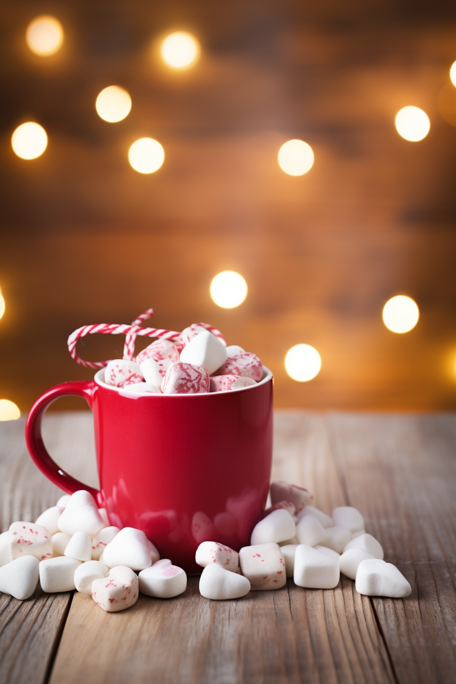 Festive red mug filled with peppermint marshmallows and candy canes, set against a warm bokeh light background on a wooden table.