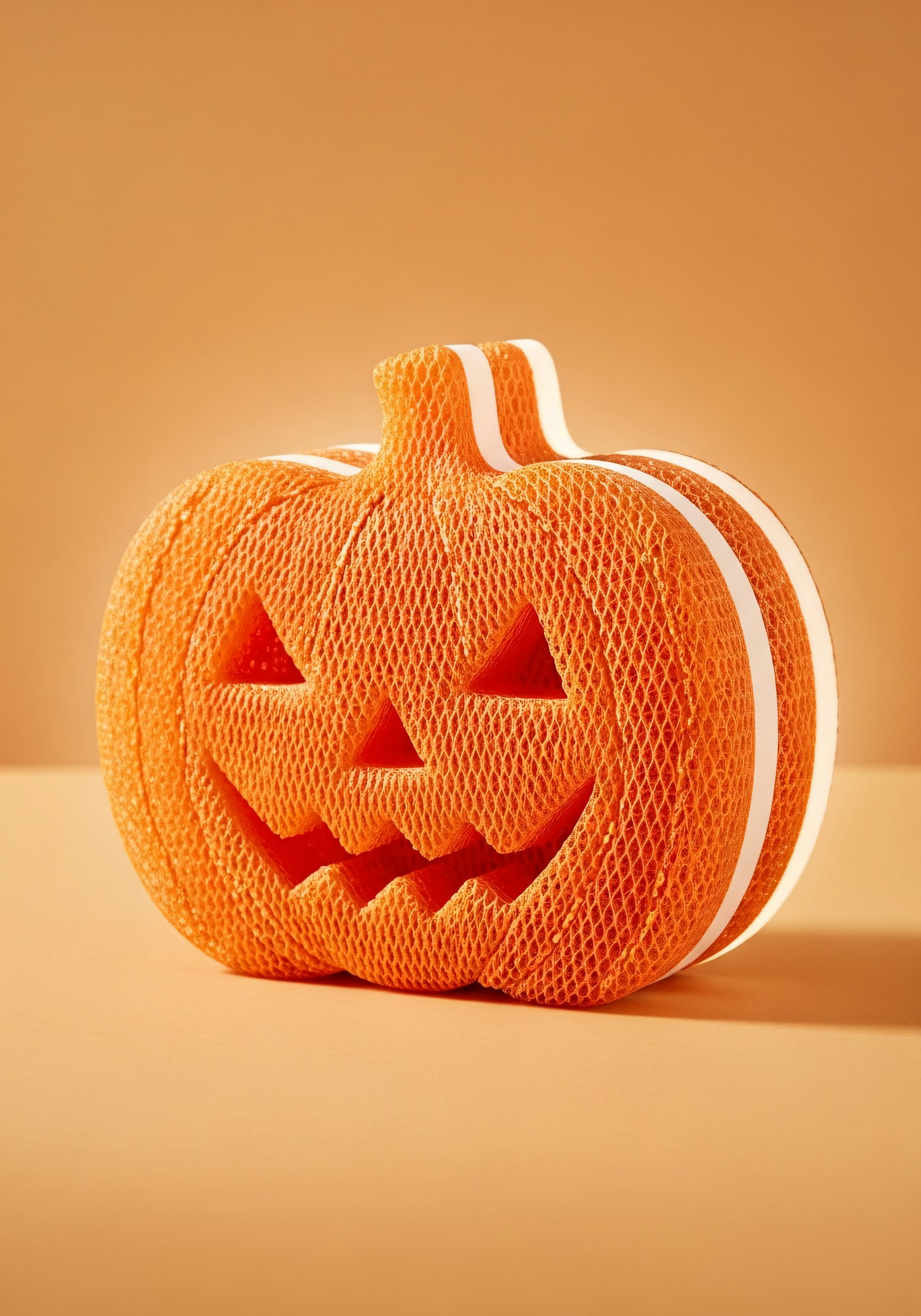 A textured orange jack-o'-lantern decoration with a mesh design, set against a warm orange background, perfect for Halloween themes.