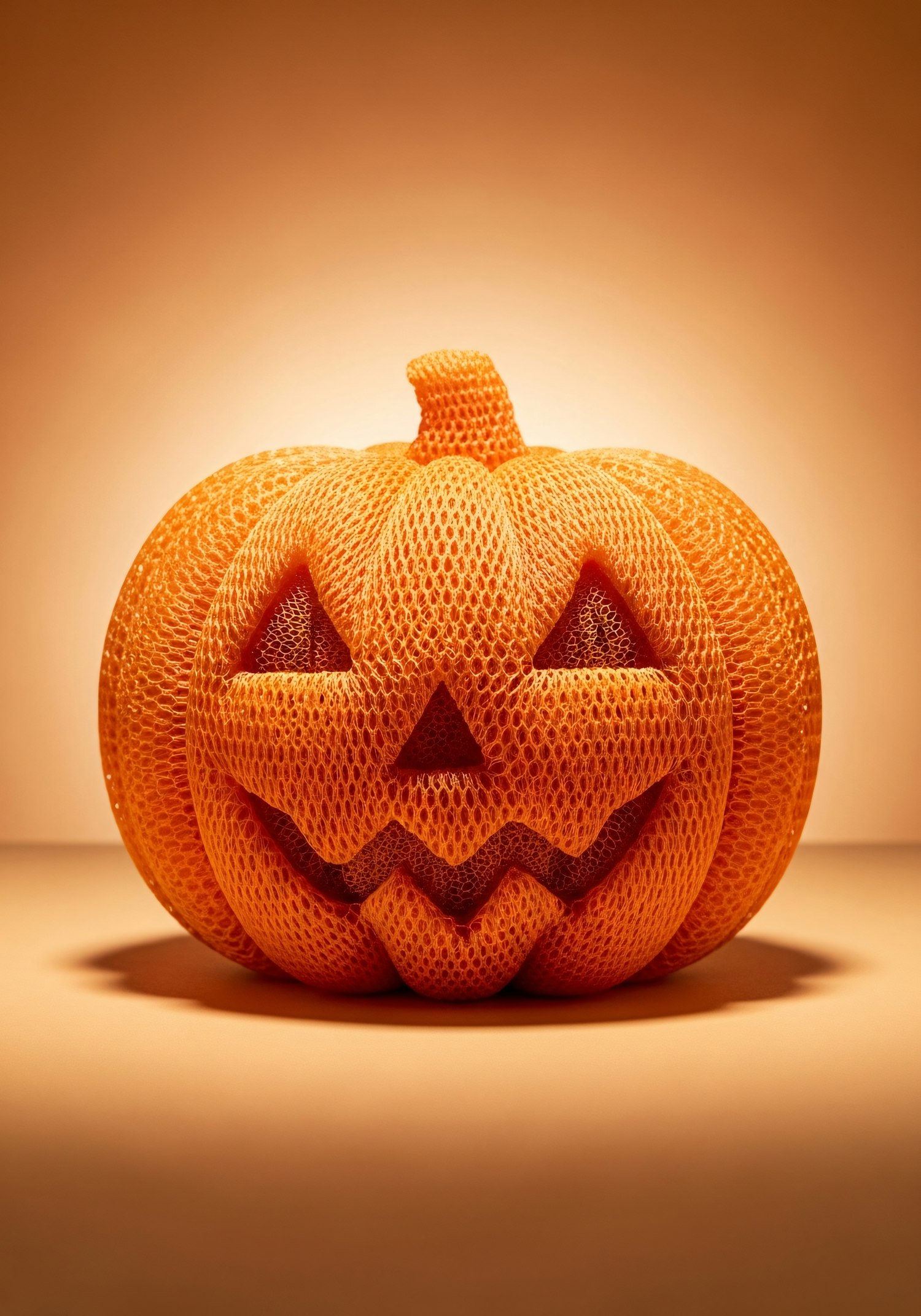 A textured orange jack-o'-lantern with a carved face, set against a warm gradient background, showcasing intricate details and festive charm.