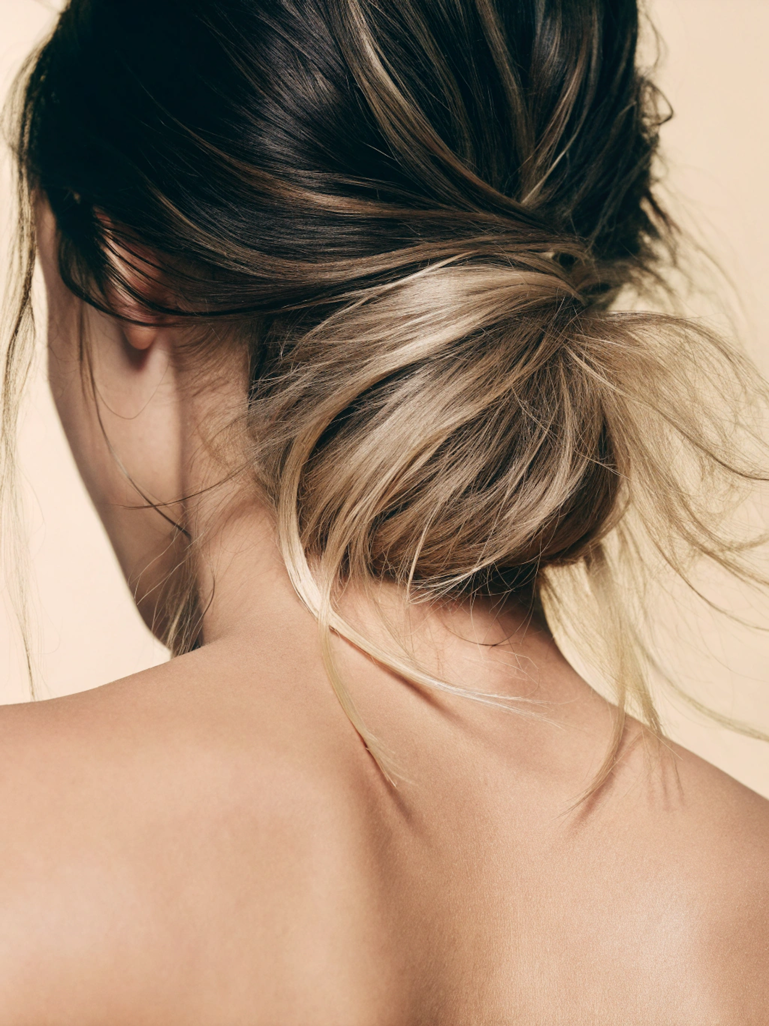 Close-up of a messy low bun hairstyle with dark brown and blonde highlights, set against a soft beige background.