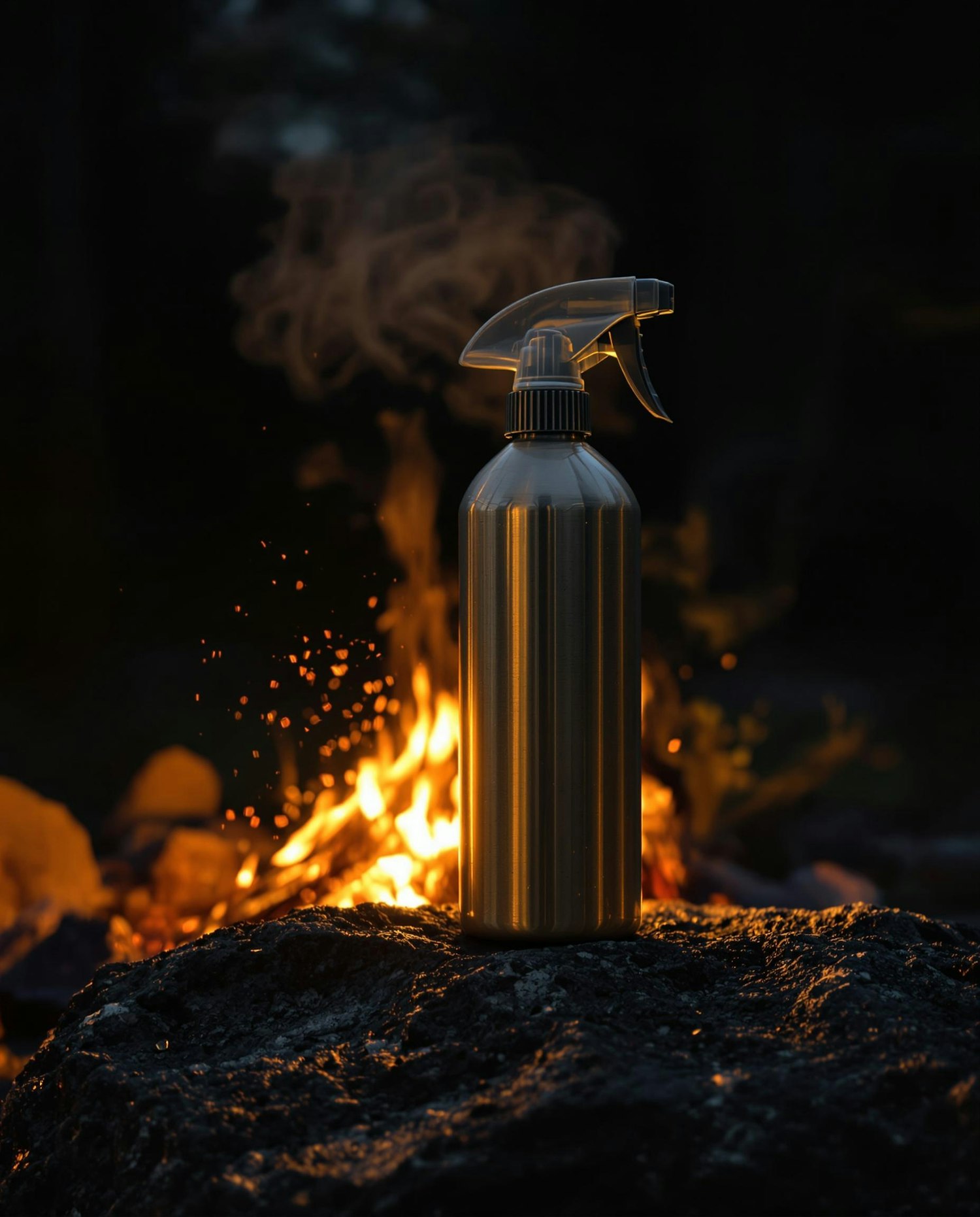 A metallic spray bottle standing on a rock against the backdrop of a glowing campfire, embers flying, creating a dramatic evening scene.