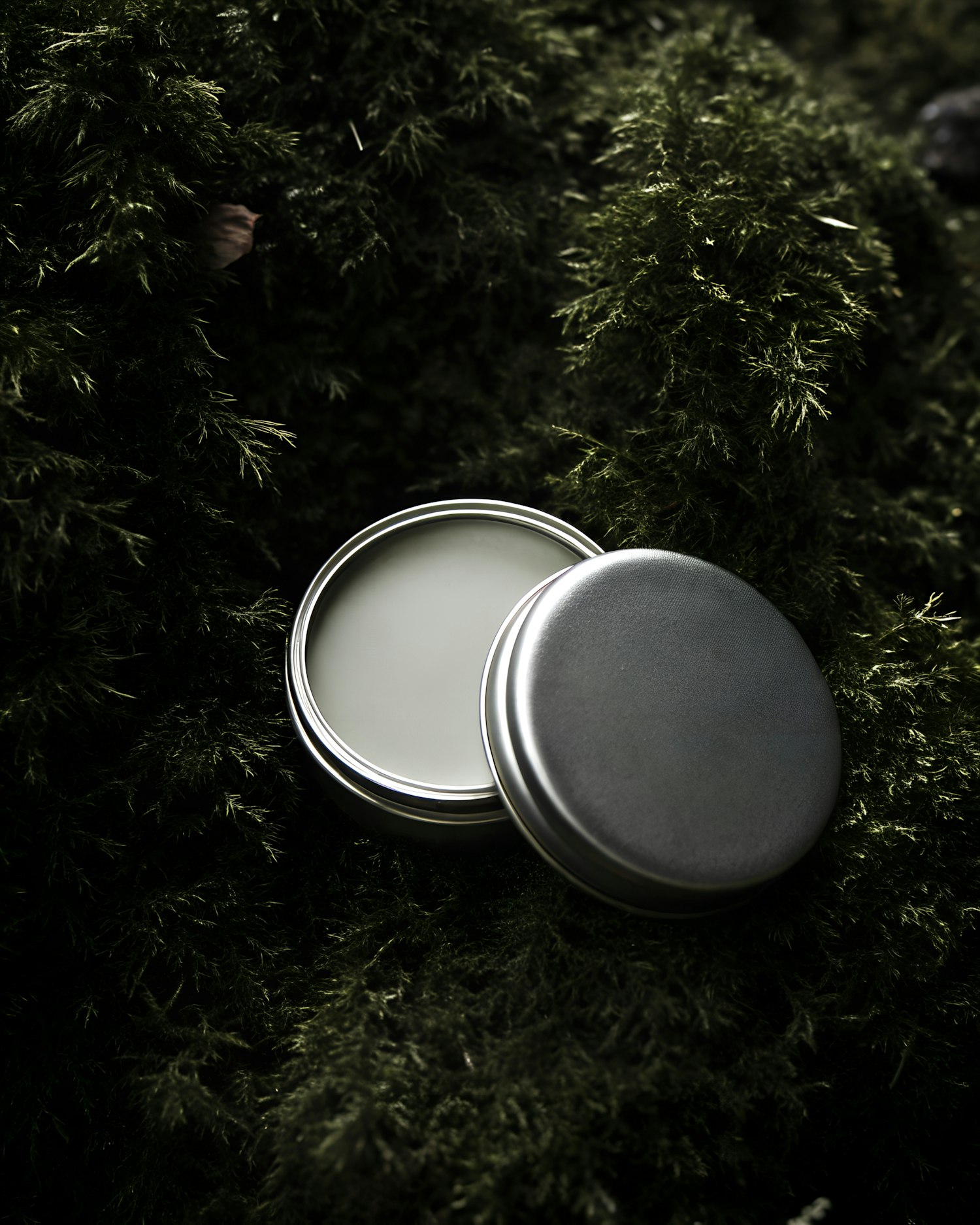 Open metal tin with creamy balm on lush green moss, creating a natural and eco-friendly aesthetic with soft, diffused lighting.