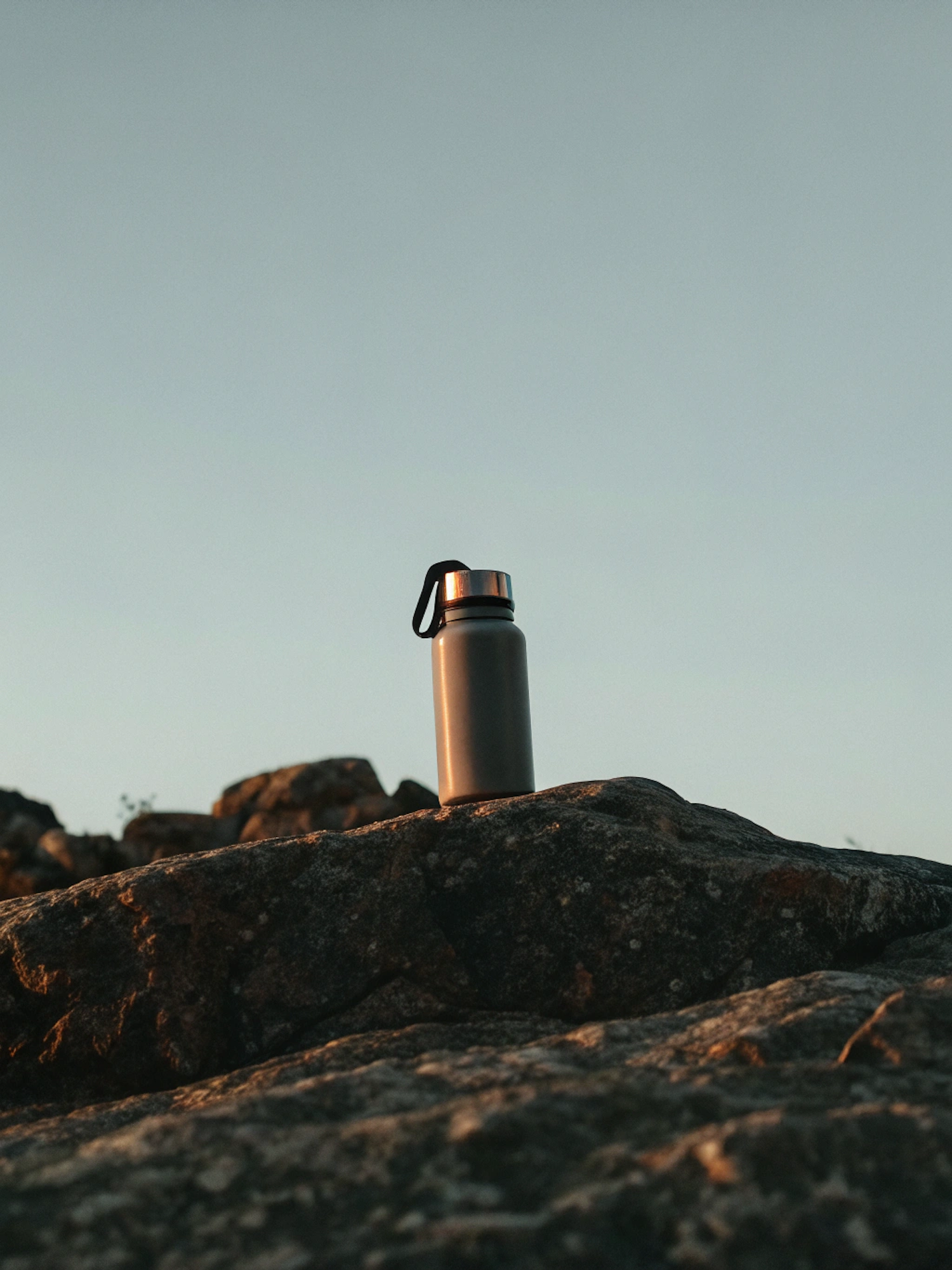A metallic water bottle on sunlit rocks with a clear sky backdrop, perfect for outdoor or adventure-themed visuals.