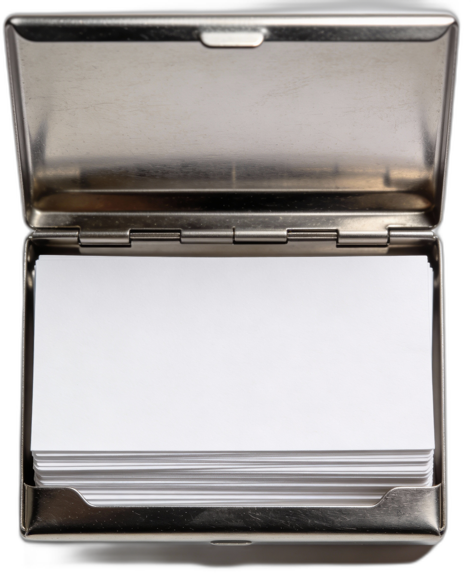 tight shot around an open metal business card case with blank cards inside. tne image is a close up on the case, the background cant be seen. centered, symmetrical, photographed from above