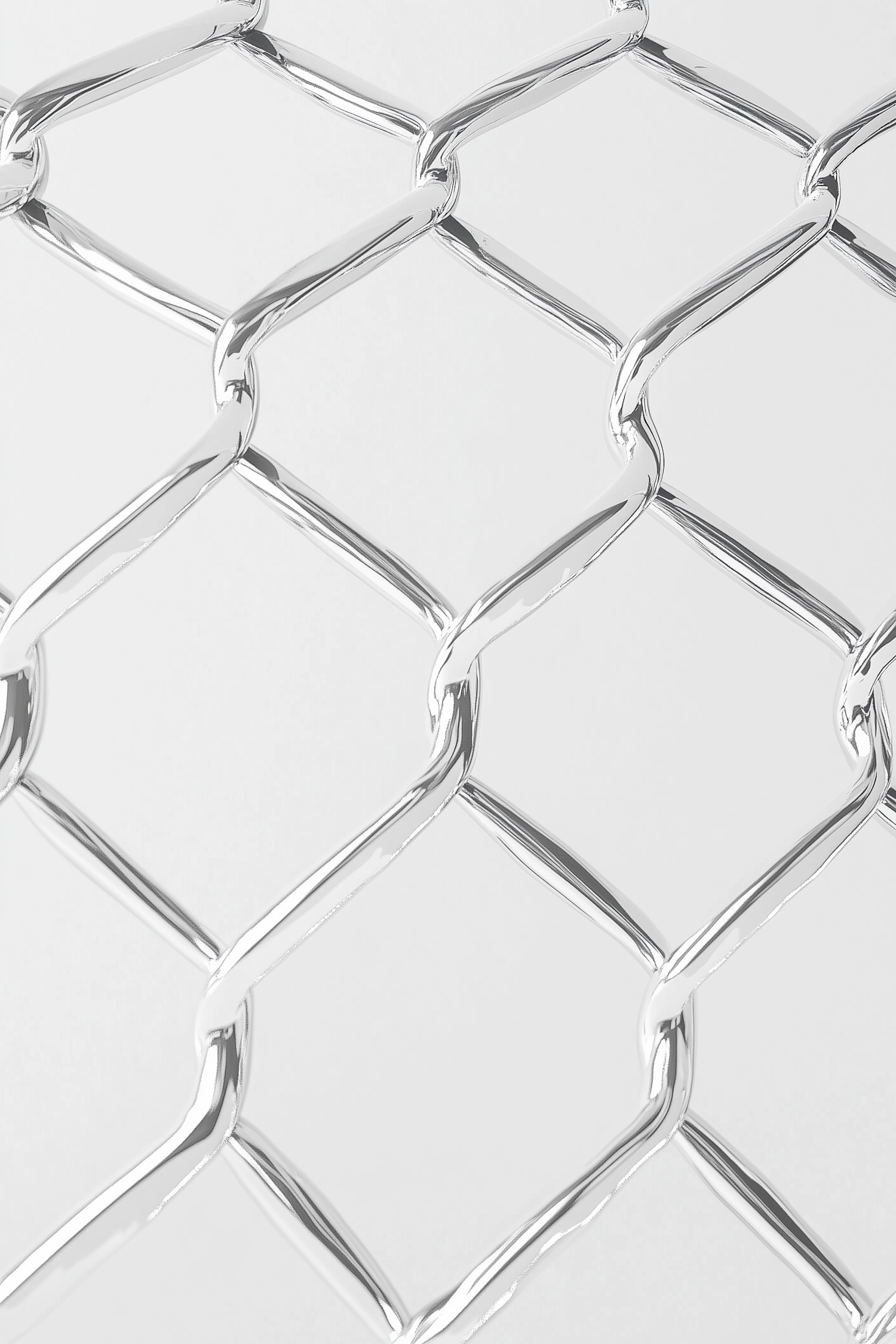 Close-up of a shiny metallic chain-link fence with a diamond pattern, showcasing its smooth, reflective surface and intricate design.