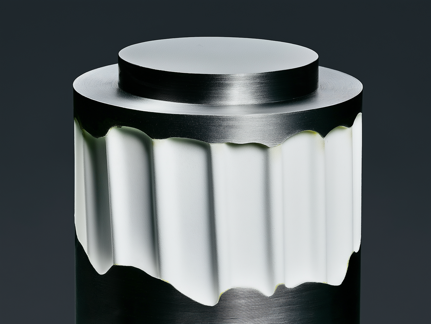 A close-up of a detailed metallic cylindrical object with a corrugated design, showcasing precision and texture under directional lighting.