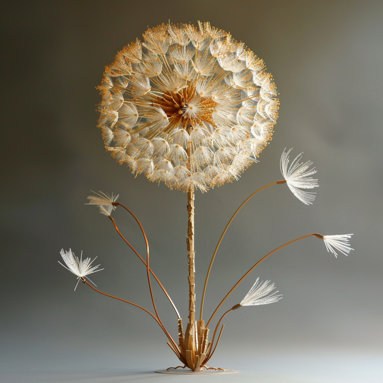 Intricate dandelion sculpture with delicate seeds and earthy tones, capturing the essence of nature's beauty.