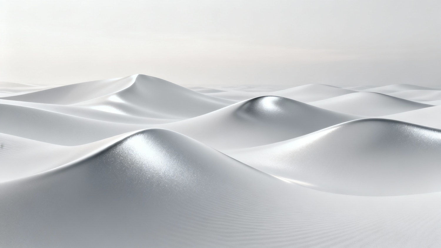 A serene landscape of smooth, metallic dunes under soft lighting, creating a tranquil and otherworldly atmosphere.