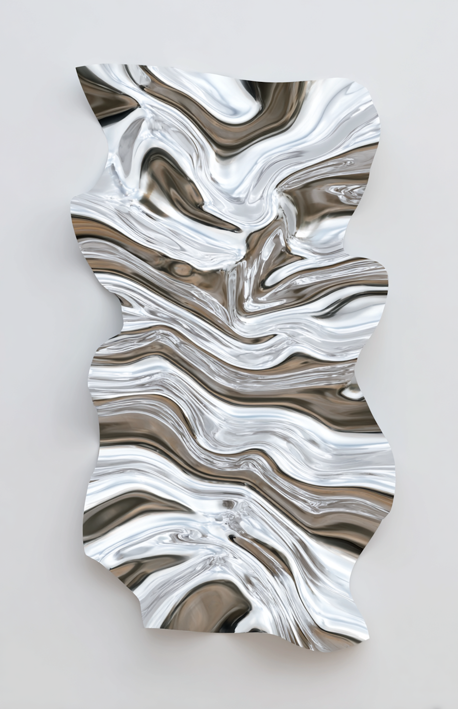 Abstract metallic artwork with fluid, reflective patterns in silver and bronze tones, creating a dynamic and flowing visual effect.